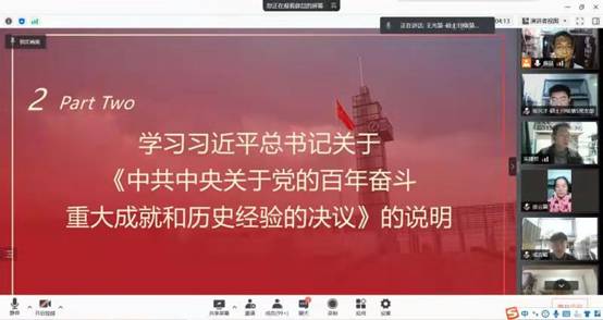 本次学习由薛喆同志主持。会议伊始,必赢bwin官网登录入口党员突击队队长白延军老师说明此次学习的重点与意义。他强调虽然线上学习的形式稍显简单,但希望同志们认真对待组织生活,保持“团结紧张,严肃活泼”的传统,结合抗“疫”的所见所闻、所思所行,更深入地理解十九届六中全会精神。随后薛喆同志引导大家学习十九届六中全会通过的《中共中央关于党的百年奋斗重大成就和历史经验的决议》以及习近平总书记对此的说明。通过学习两份重要文件,同志们对六中全会议题的必要性逻辑上更加贯通,对党的百年奋斗重大成就情感上更加崇敬,对党的百年奋斗历史经验认识上更加深刻。回顾历史,是为了展望未来,认清现实,从中汲取智慧与力量,更加勇毅地前行。同志们对自己身为青年,重任在肩的历史使命有了更深厚的体会。