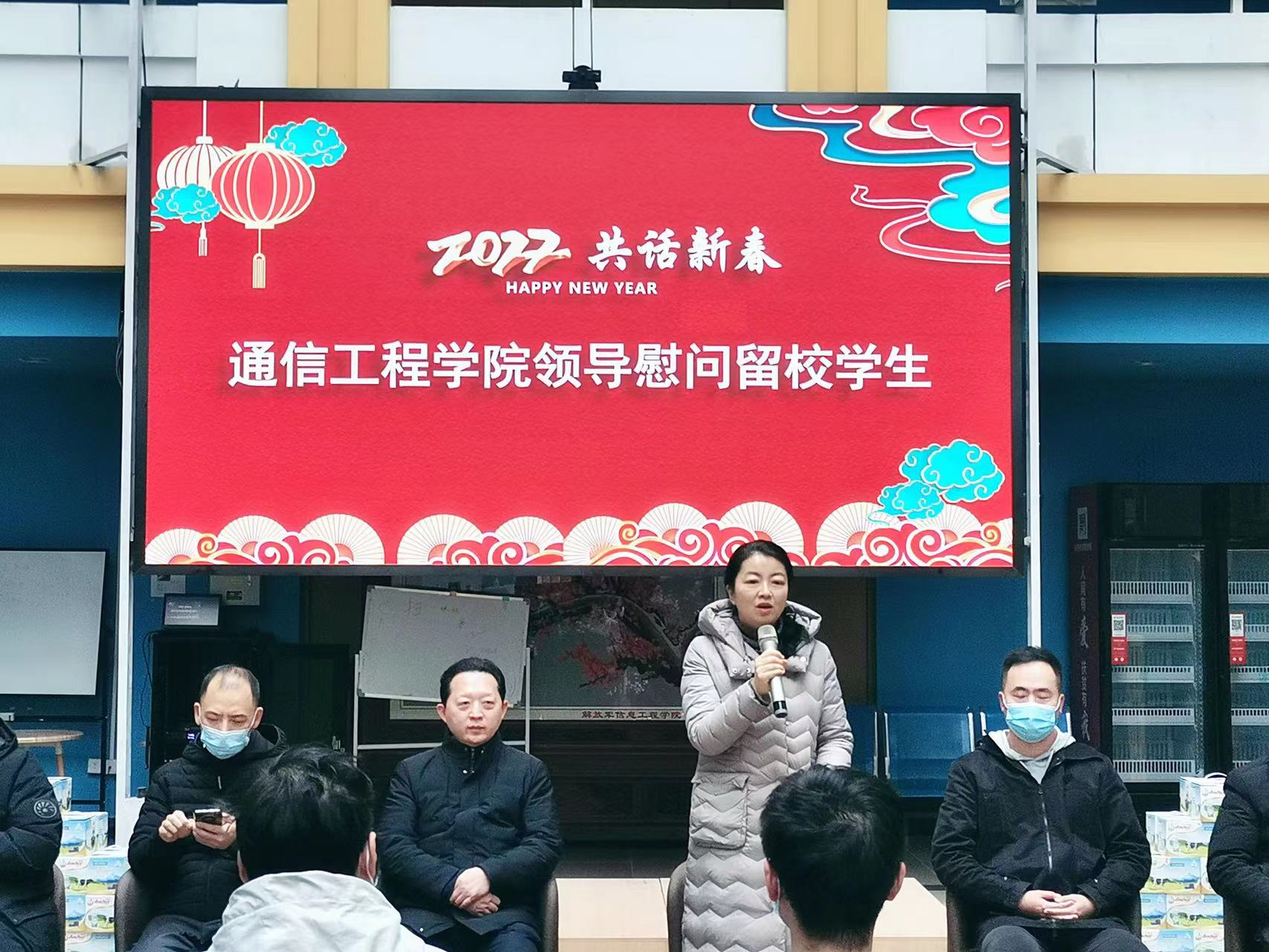 活动现场年味浓浓、温馨欢乐。学院精心布置了过年装饰,有“福字”“虎年吉祥物”“新春祝福语”等等,现场流淌着欢快的新春音乐。首先,老师们与留校学生进行了亲切的交谈,详细询问留校学生留校过年的原因、家乡疫情情况、生活状况和假期计划,认真倾听学生需求,同时把国家的关怀、学校的关爱、老师的关心带给学生,消除困难学生的后顾之忧。李赞希望同学们留校期间要保持愉悦的心情进行学习,她表示,在疫情的特殊时期,因学习、科研等原因选择留校,将会是毕生难忘的回忆,希望各位同学充分利用假期“充电”,广泛涉猎各学科门类知识,做一名全面发展的优秀人才。李云松叮嘱大家合理安排假期生活,营造健康文明的生活环境,学好专业技能、锻炼自身本领、努力提升自我的同时,加强身体锻炼,合理作息,健康饮食,度过一个欢乐、祥和、充实的春节。沈强介绍了学院假期服务保障安排,要求同学们多与家人沟通,让家长放心、安心,定期与辅导员、老师联系,有困难第一时间跟学院、辅导员沟通,学院将全力以赴为他们排忧解难。
