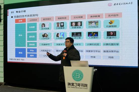 活动伊始,王楠楠通过一段视频带领同学们走近了人工智能领域,从计算机视觉(CV)到3D打印,从自动驾驶技术到语音驱动的说话人口型合成,王教授幽默生动的讲解让同学们沉浸在前沿技术的魅力之中,畅想未来的无限可能。随后,王教授结合人工智能技术体系架构,向同学们介绍了科技发展前沿、创新创业大潮、人才需求黑洞和个人认知发展等方面的专业前景,并详细讲解了大家最为关注的个人发展问题,展示了就业、升学和创业三个不同发展路径的规划和关键节点。