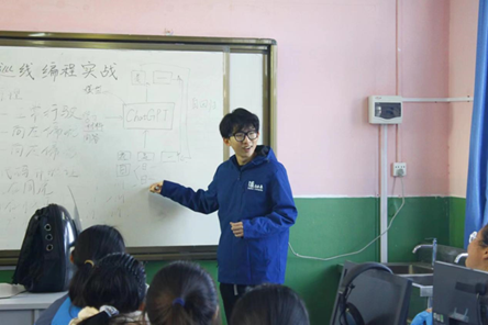刘轩博同学带领科技组成员来到孙镇初中的科创筑梦小屋,向当地学生普及人工智能的知识。通过演示ChatGPT对古诗句的续写能力并介绍其大致原理,激发学生们对当前通用人工智能发展的兴趣,引导他们思考人工智能对社会发展的影响。学生们在课上表现活跃,连连惊叹,纷纷表示要努力学习科技知识,增长才干。