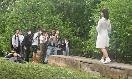 户外实践过程中,林老师选取了三处拍摄场景。从人物环境的契合,近景、中景、远景的层次感,延伸线的构图等九方面介绍了人像拍摄技巧,手把手进行教学。他强调“摄影不仅要掌握知识和技巧,更要在实践中反复体会,最终内化为一种不需要刻意强求的内在审美。”林老师将摄影知识寓教于乐,同学们积极参与,认真观摩,既收获了美照,亦学到了满满的干货。